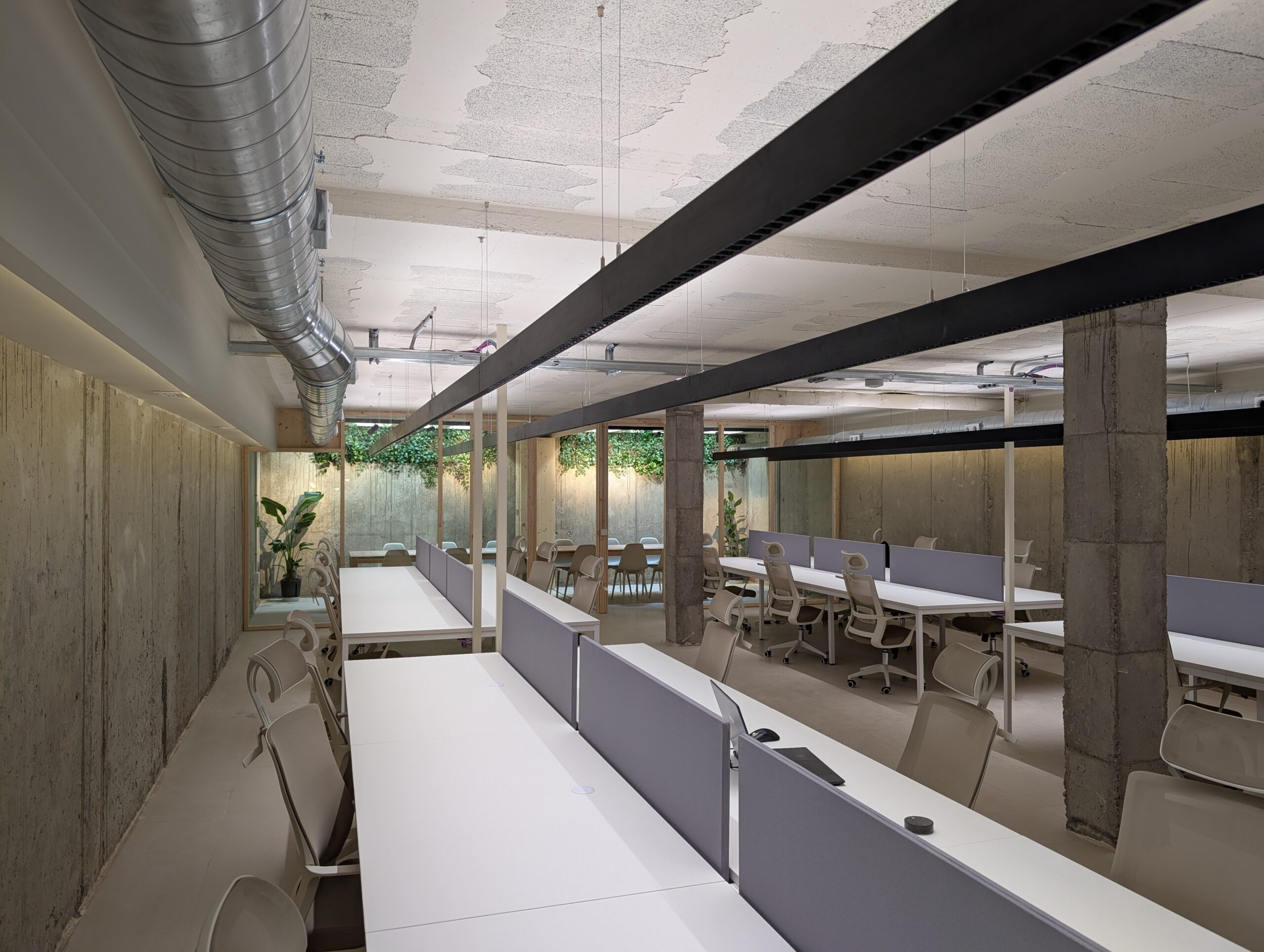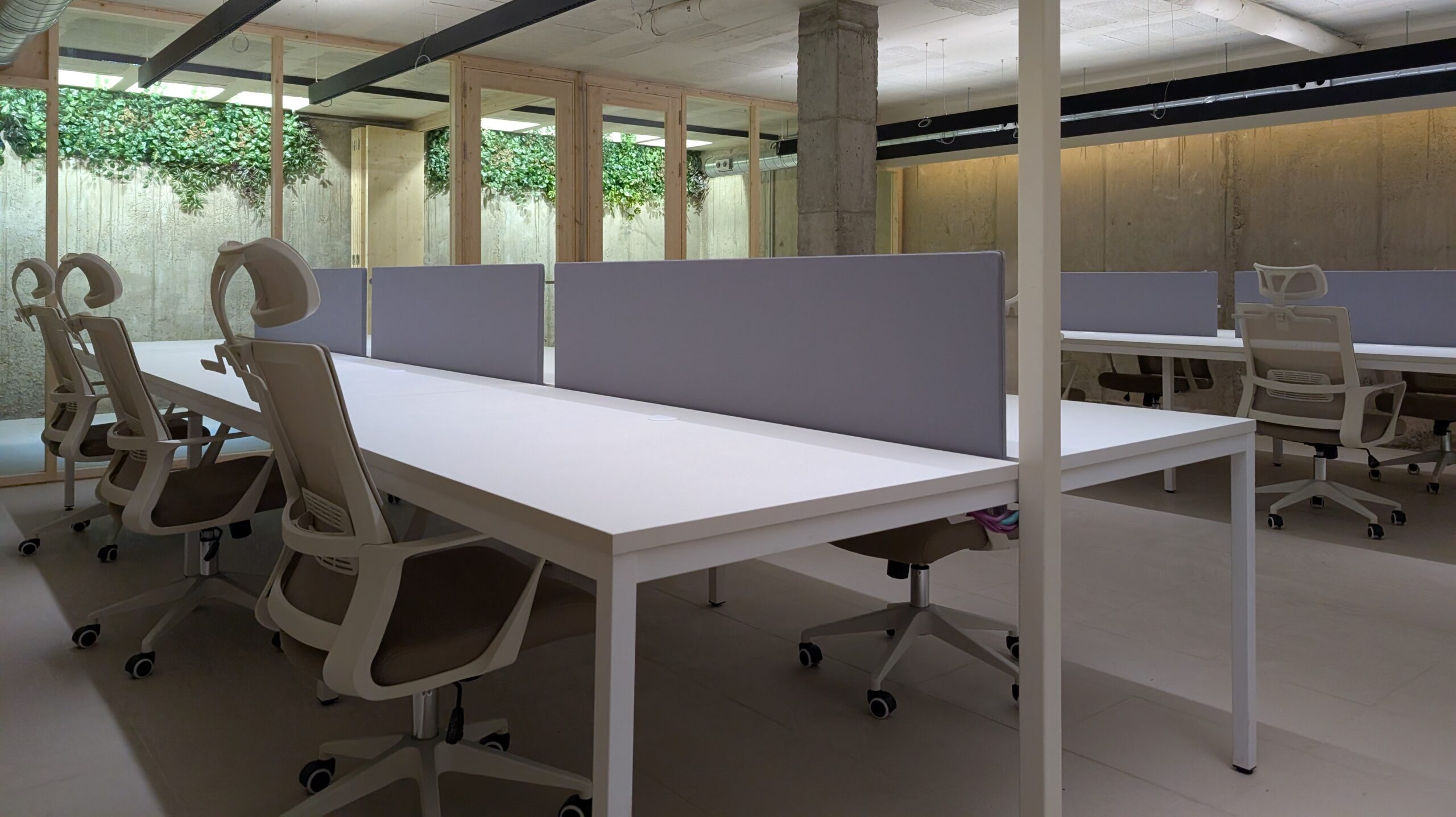Tu escritorio en Gràcia. Mesa fija de 160×80. Silla ergonómica. Separador acústico. Iluminación paramétrica. Sistema de climatización y renovación de aire. Café y zonas comunes. Taquilla privada.